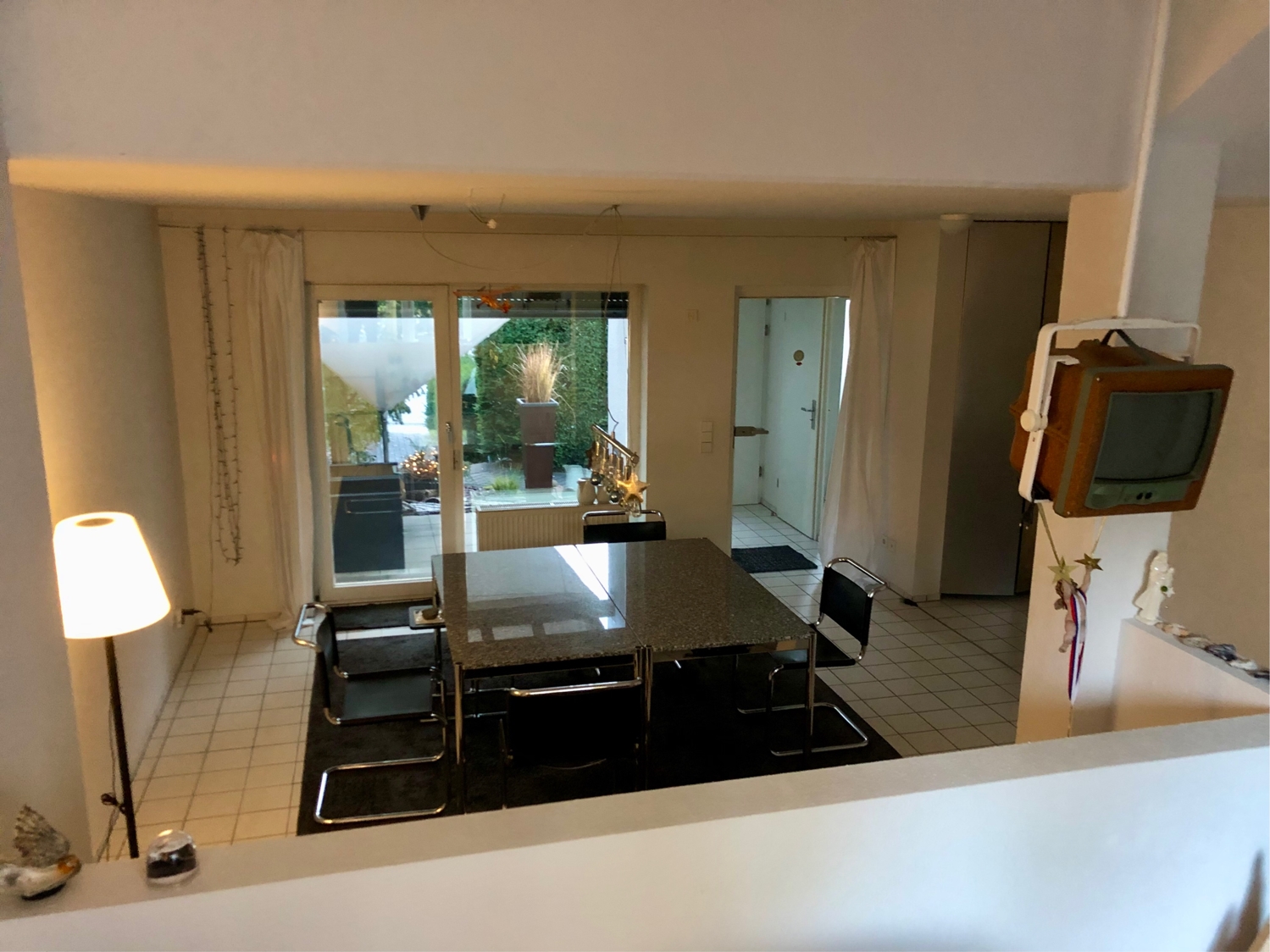 Im EG befindet sich neben dem Essbereich mit Zugang zur ersten Terrasse die Garderobe sowie das geflieste Gäste-WC. Von einer Empore eine halbe Treppe höher, können Sie auf das Esszimmer hinab schauen. Auf dieser Ebene ist die hochwertige Einbauküche von Bulthaup mit sämtlichen Elektrogeäten von Gaggenau. Dieser gesamte Bereich ist hell gefliest.